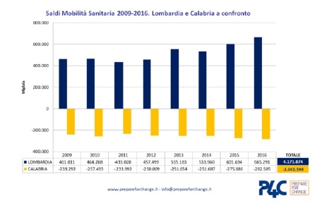 Nel periodo 2009-2016 la Calabria paga a varie Regioni per la Mobilità oltre 2 miliardi di euro mentre la Lombardia riceve oltre 4 miliardi di euro. Se rapportiamo la spesa al costo di costruzione di un ospedale medio, sarebbe come dire che la Calabria perde le risorse per 8 ospedali nuovi e la Lombardia ne riceve per 16!